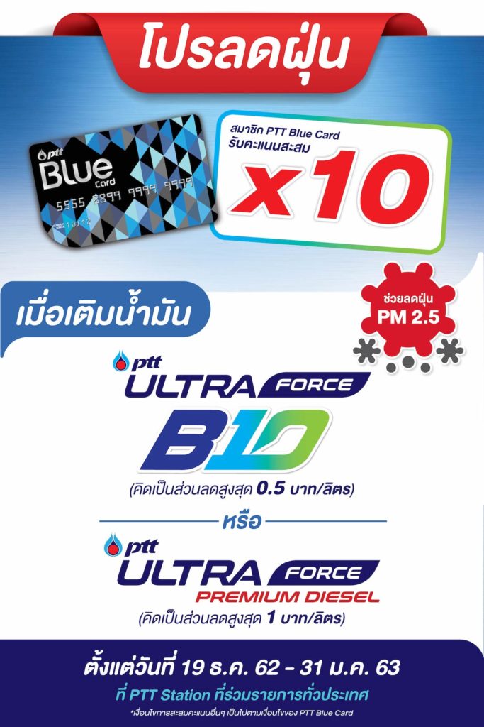 PTT Station ร่วมลดปัญหาฝุ่นละออง PM 2.5 จัดโปรโมชั่นพิเศษ เชิญชวนใช้น้ำมันดีเซลคุณภาพที่เป็นมิตรกับสิ่งแวดลอม รับคะแนนสะสม PTT Blue Card 10 เท่า ตั้งแต่ 19 ธันวาคม 2562 – 31 มกราคม 2563