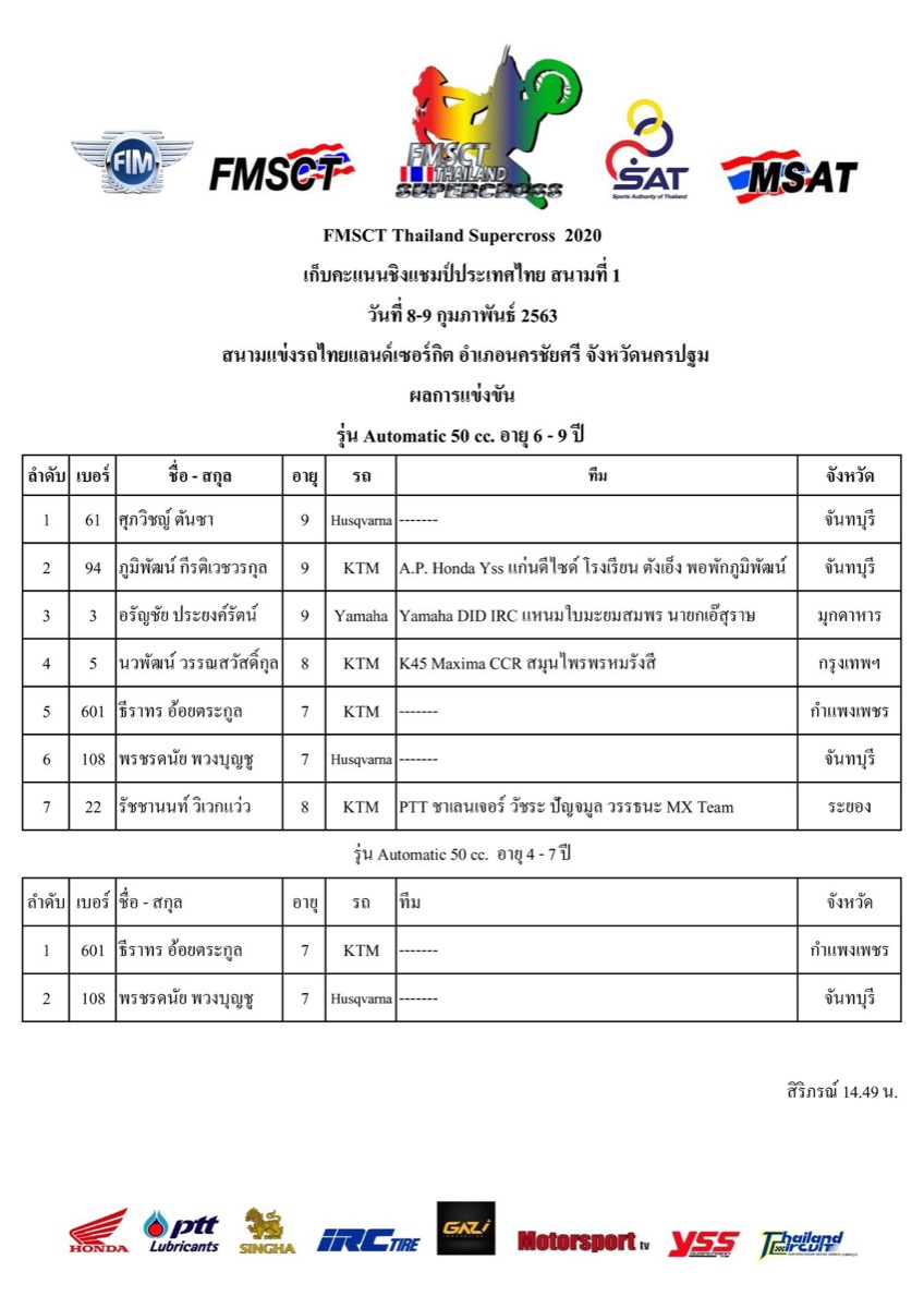 เปิดฤดูกาลกันถ้วนหน้าสำหรับเกมวิบากชิงแชมป์ประเทศไทย รายการ FMSCT Thailand SX ในรุ่นเล็กสุดของรายการอย่าง Automatic 50 ซีซี รุ่นพื้นฐานบันไดขั้นแรกของเหล่าอนาคตแชมป์ประเทศไทย ที่โดยมากมักจะผ่านประสบการณ์จากรุ่นนี้แล้วขยับชึ้นขึ้นไปจนถึงรถแข่งในแบบ full sized ในอนาคต
