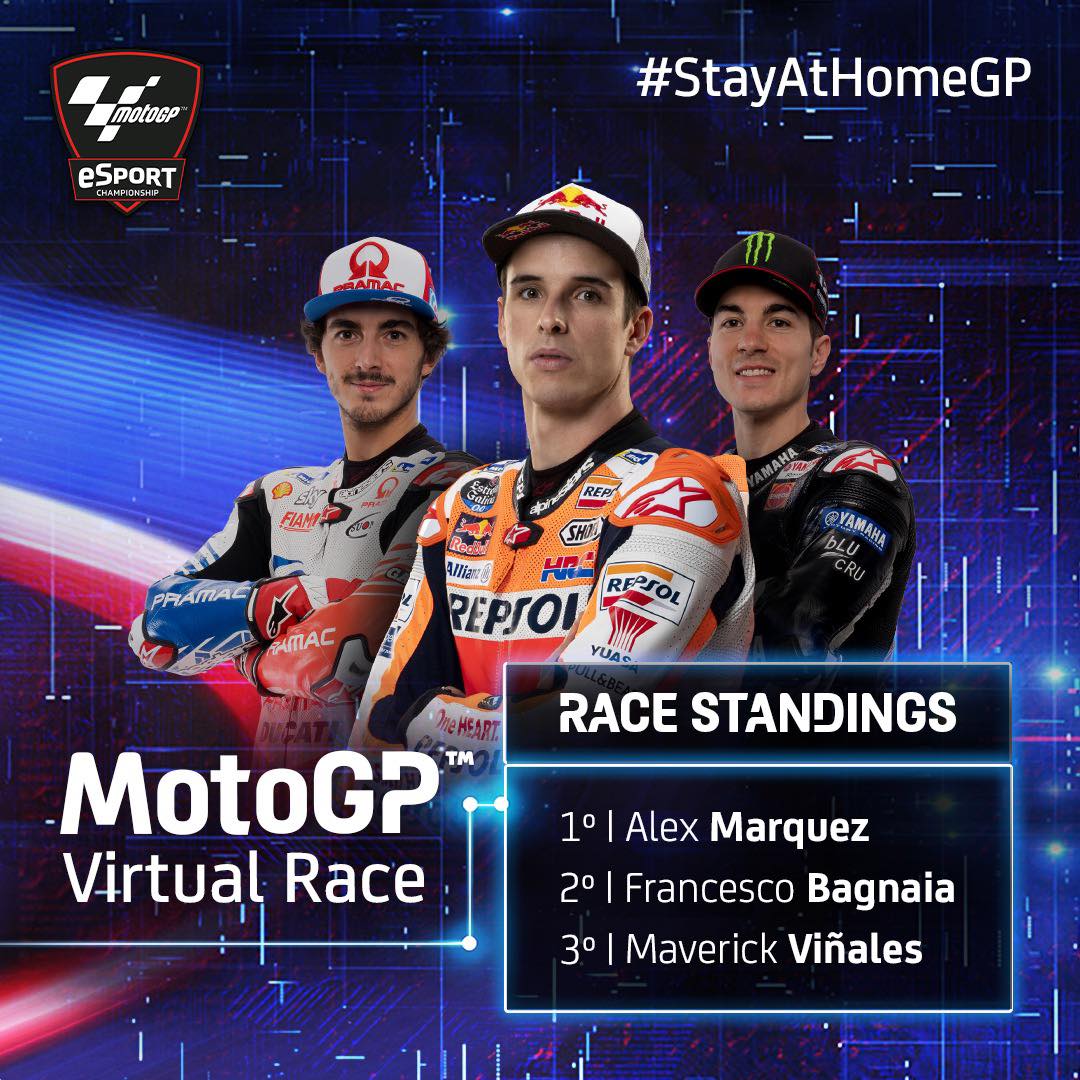 ผลในเรซนี้ปรากฏว่า อเล็กซ์ มาร์เกซ คว้าแชมป์ประเดิม เวอร์ชวล เรซ ครั้งแรกไปครองที่ มูเจลโล ตามด้วย บันยาญ่า และ บีญาเลส ขณะที่ กวาร์ตาราโร จบเรซในอันดับ 4 ตามด้วย กวาร์ตาราโร ในอันดับ 5