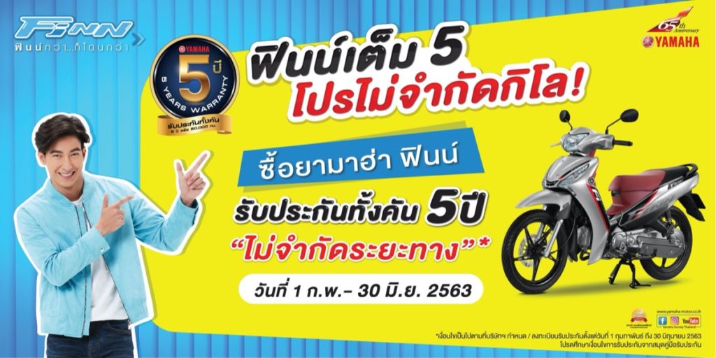 ไทยยามาฮ่า ตอบสนองความต้องการกลุ่มลูกค้าธุรกิจบริการ ผ่านแคมเปญพิเศษ “ฟินน์เต็ม 5 โปรไม่จำกัดกิโล” รับประกันทั้งคัน 5 ปีไม่จำกัดระยะทาง สำหรับผู้ที่ซื้อ ยามาฮ่า ฟินน์ ทุกรุ่น ระหว่าง 1 ก.พ.-30 มิ.ย. 63