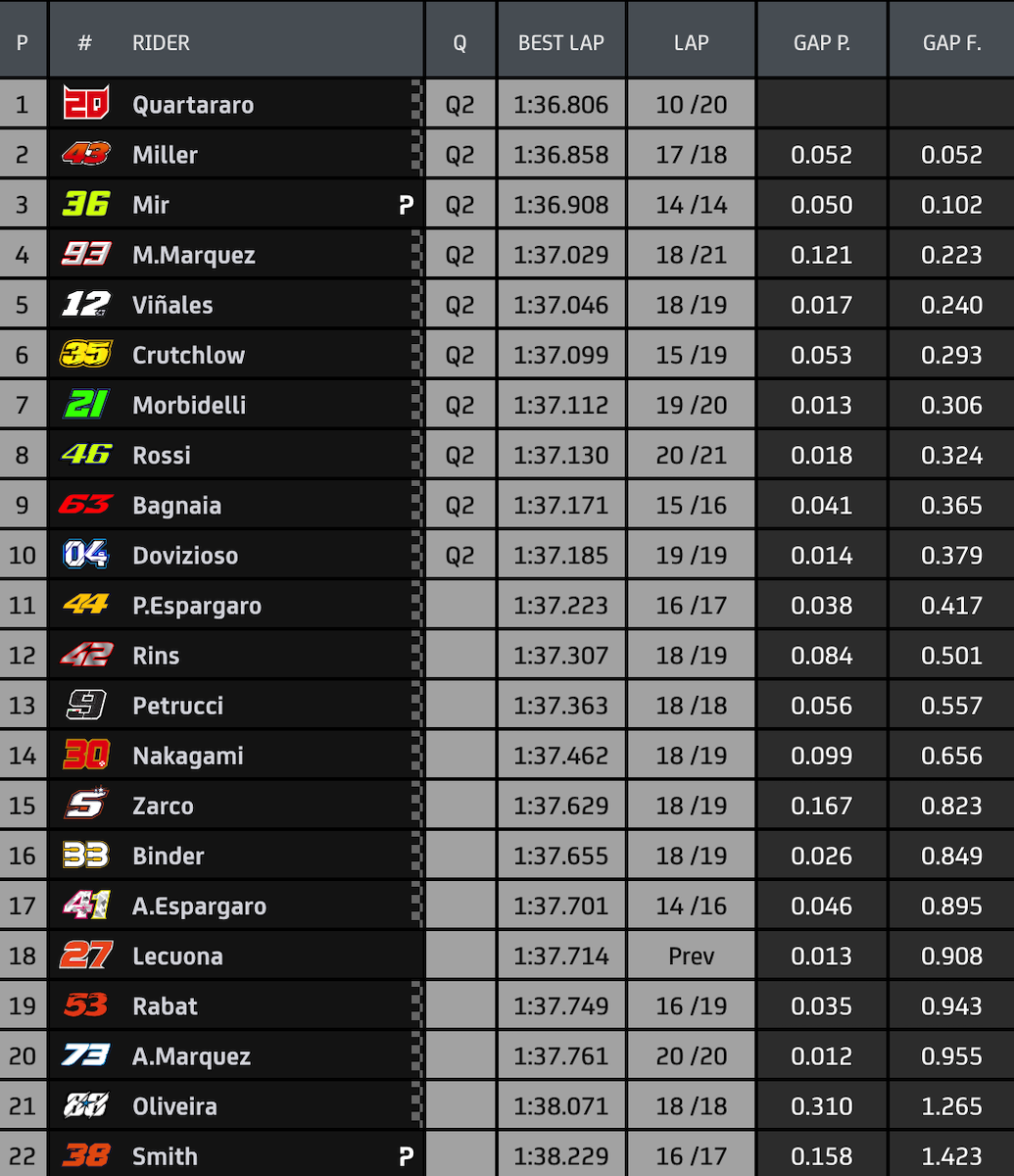 ผลปรากฏว่า กวาร์ตาราโร ที่โดนลงโทษห้ามซ้อม 20 นาที เมื่อวานนี้ กลับเข้าสู่ฟอร์มที่แท้จริงอีกครั้ง แม้จะออกมาให้สัมภาษ์ณ์ว่า M1 ในปี 2020 ขี่ยากกว่าเดิม แต่นักบิดเฟรนช์กดเวลาทะยานขึ้นมาเป็นอันดับ 1 ด้วยเวลาต่อรอบ 1 นาที 36.806 วินาที ทำลายสถิติเวลาต่อรอบของสนามนี้ลงอย่างราบคาบ เฉือน แจ็ค มิลเลอร์ นักบิดออสซี่จาก พรามัค ดูคาติ เพียง 0.052 วินาที ส่วนอันดับ 3 เป็นของ โจอัน เมียร์ นักบิดสแปนิชจาก ทีม ซูซูกิ เอ็คสตาร์ ตามหลัง 0.102 วินาที