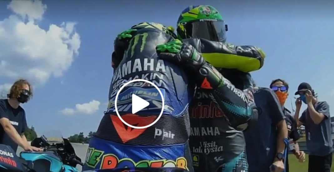 “เดอะด็อกเตอร์” วาเลนติโน รอสซี่ จอมเก๋าอิตาเลียนจาก มอนสเตอร์ ยามาฮ่า สวมกอดแสดงความดีใจกับ มอร์บิเดลลี จาก ปิโตรนาสยามาฮ่า ที่ได้ขึ้นโพเดี้ยมครั้งแรกในพรีเมียร์คลาส