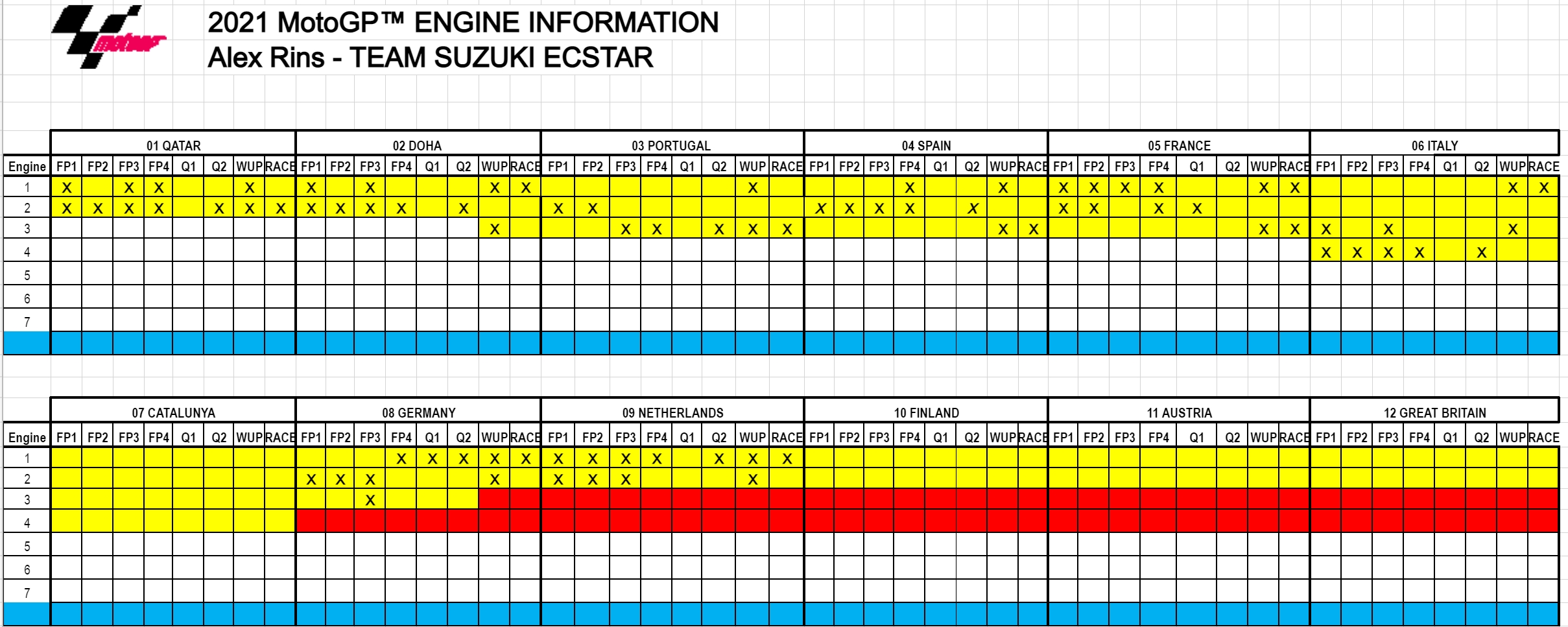 | RIDER | BIKE | ENGINES USED | ENGINES WITHDRAWN |