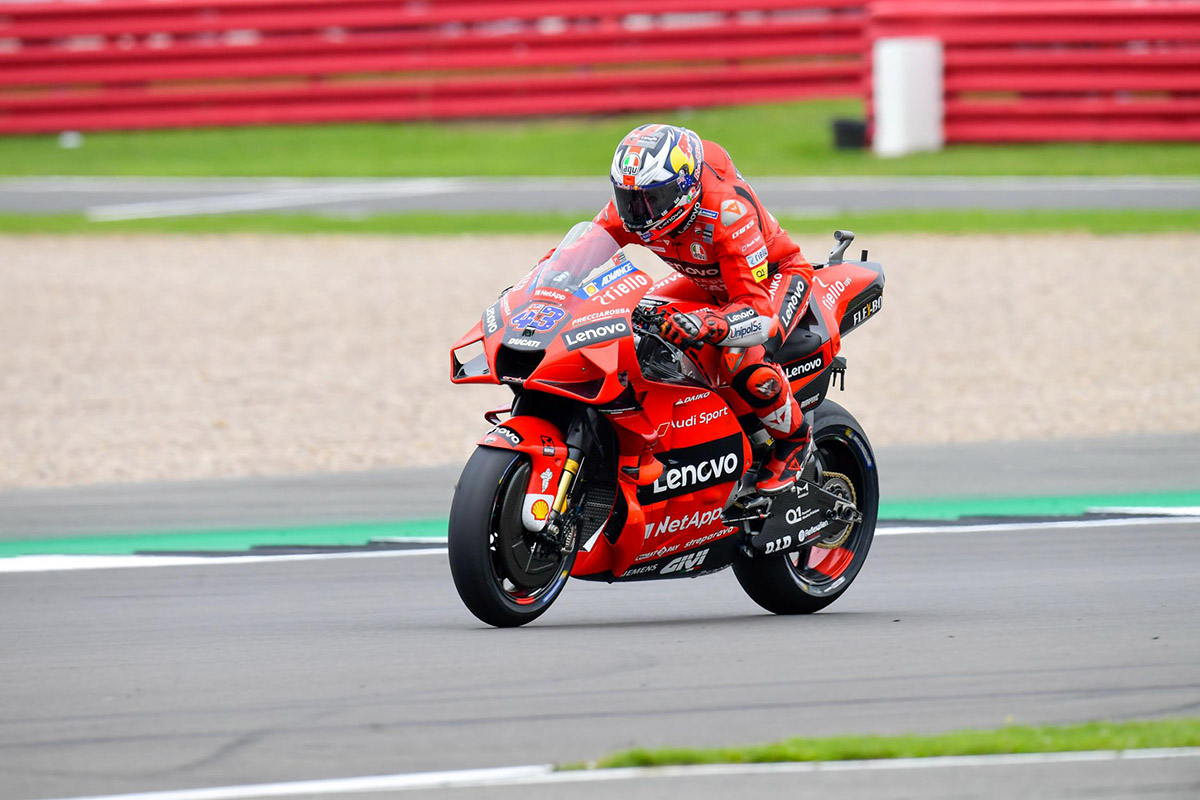 แจ็ค มิลเลอร์ นักบิดออสซี่จาก ดูคาติ เลโนโว ทีม กดเวลาทะยานขึ้นเป็นจ่าฝูงในการซ้อมรอบ FP3 ของศึก โมโตจีพี สนาม 12 บริติช กรังด์ปรีซ์ เฉือน อเล็กซ์ เอสปาร์กาโร นักบิดสแปนิชจก อพริเลีย เพียง 0.098 วินาที ก่อนลุ้นควอลิฟายคืนวันเสาร์นี้ที่ ซิลเวอร์สโตน