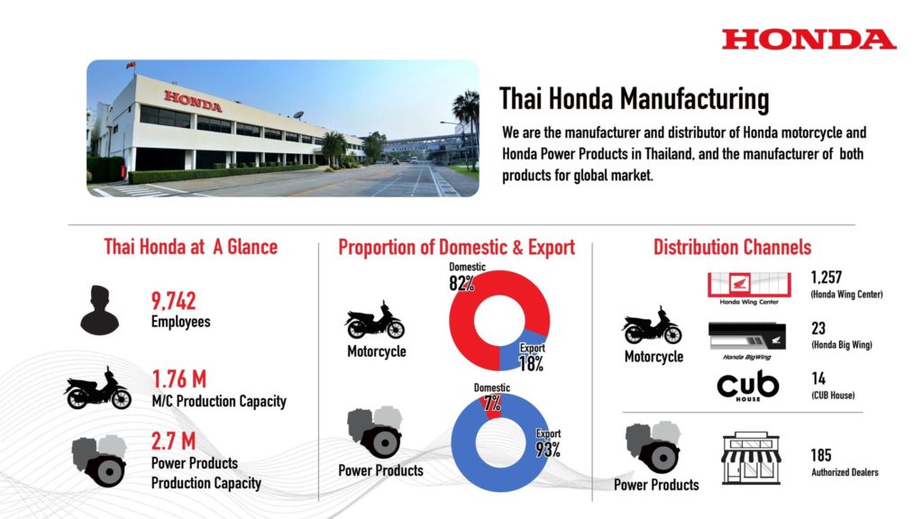 “นอกจากรถจักรยานยนต์แล้ว ไทยฮอนด้ายังเป็นผู้ผลิตเครื่องยนต์อเนกประสงค์ (Power Products) อีกด้วย อย่างไรก็ตาม ศักยภาพของเราไม่ได้จำกัดอยู่เพียงแค่การผลิตและจัดจำหน่ายภายในประเทศเท่านั้น แต่เรายังมีศักยภาพอย่างสูงในการผลิตเพื่อส่งออกสู่ตลาดโลกด้วย โดยในปัจจุบัน ไทยฮอนด้าถือเป็นหนึ่งในฐานการผลิตและส่งออกรถจักรยานยนต์ รวมถึงเครื่องยนต์อเนกประสงค์ที่สำคัญของฮอนด้าไปยังตลาดโลก”