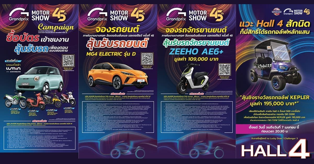 บริษัท กรังด์ปรีซ์ อินเตอร์เนชั่นแนล จำกัด (มหาชน) “ผู้จัดงาน” “บางกอก อินเตอร์เนชั่นแนล มอเตอร์โชว์ ครั้งที่ 45” ได้จัดทำเงื่อนไข สำหรับการชิงโชคลุ้นรางวัล รถยนต์ หรือ รถจักรยานยนต์ สำหรับ ผู้ที่จองรถยนต์ หรือ รถจักรยานยนต์ ภายในงาน บางกอก อินเตอร์เนชั่นแนล มอเตอร์โชว์ ครั้งที่ 45 ดังนี้